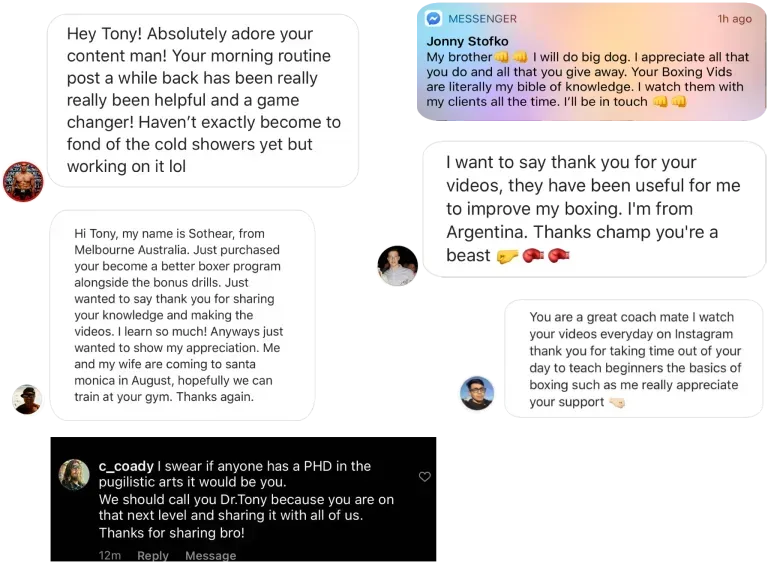 Get exclusive videos that I have never shared on any social media platform and the same drills and strategies I've used with boxers and clients like Deontay Wilder, Ronda Rousey, Brendan Schaub, Chris Hemsworth, Robbie Williams, Lewis Howes, Travis Barker, Damian Lillard, and more.